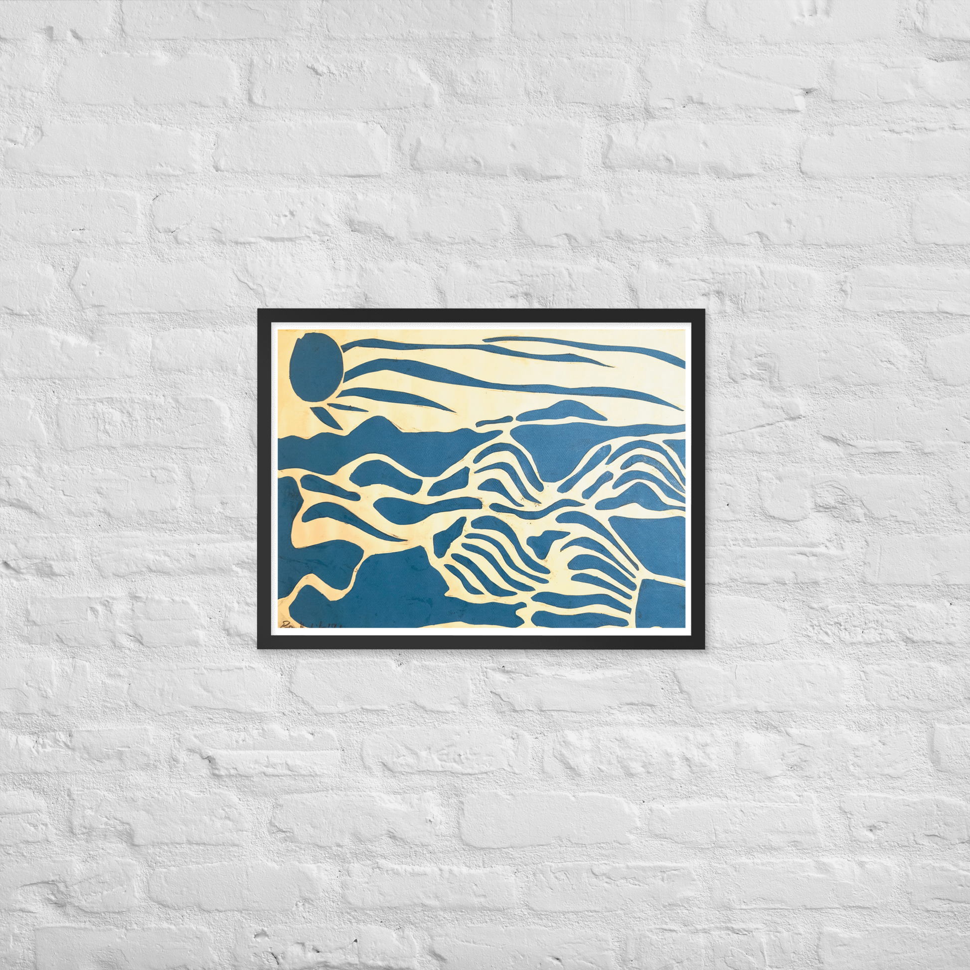 Flowing, organic blue forms sweep across the canvas, evoking waves, wind, and the fluidity of nature. The sun anchors the scene, suggesting calm amidst movement. This minimalist yet powerful composition conveys serenity, freedom, and the beauty of natural landscapes.