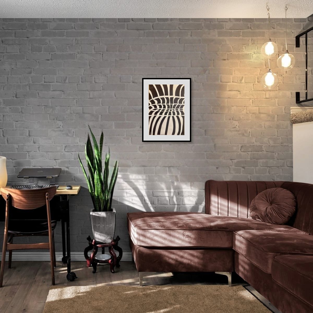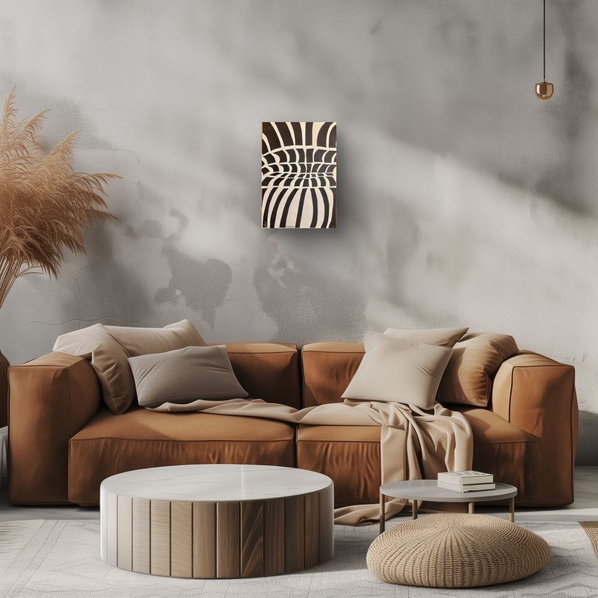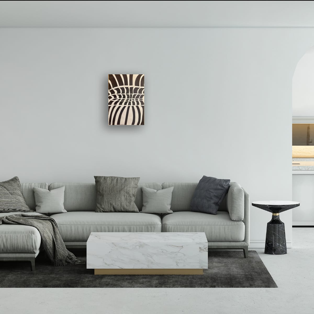 A mesmerizing arrangement of bold black-and-white lines creates an optical illusion of movement and distortion. The repeating arches and grid-like structure give the impression of a shifting, elastic space—challenging the viewer’s perception and evoking tension between order and chaos.