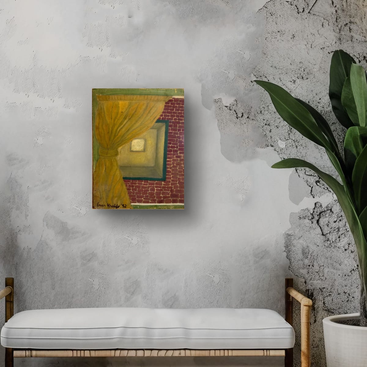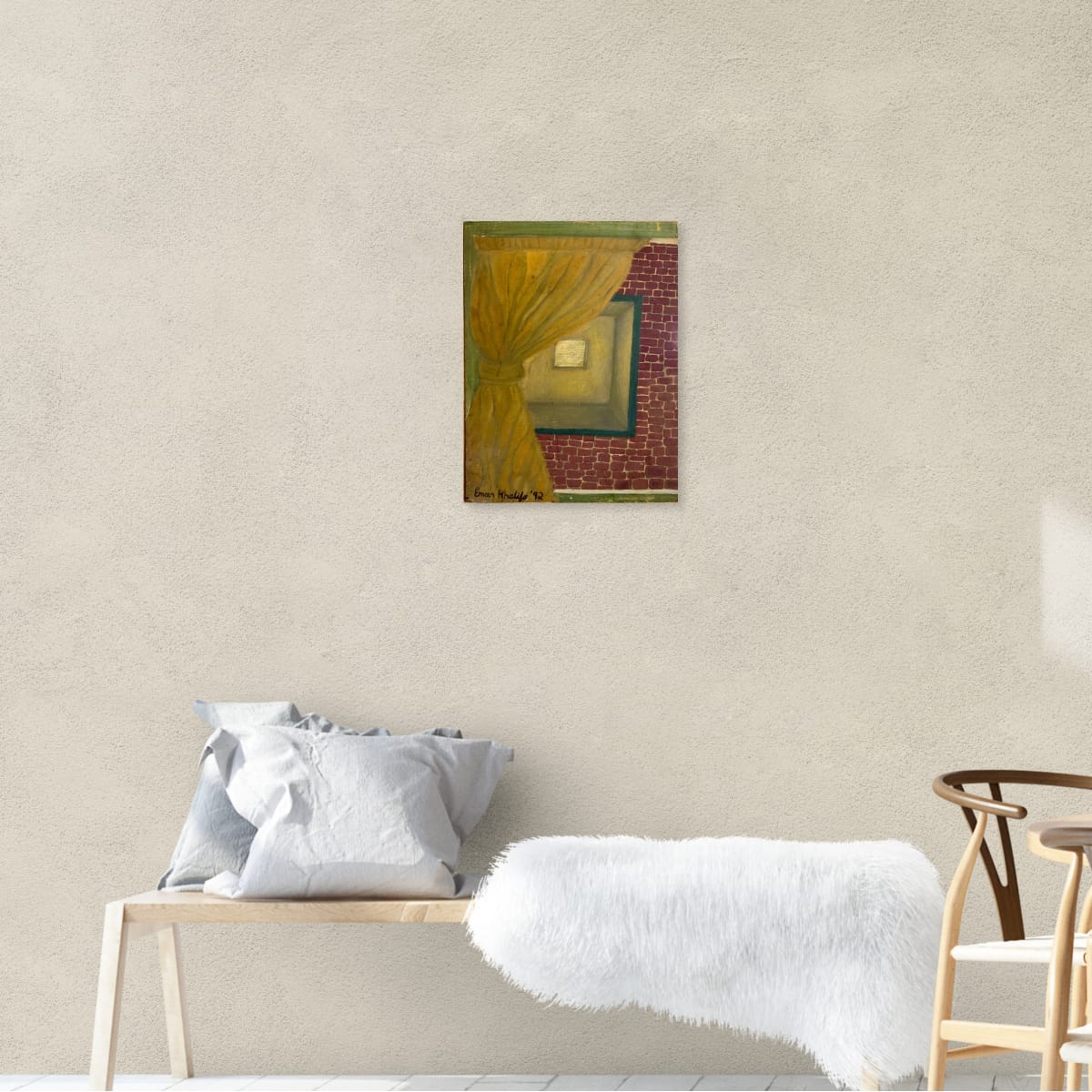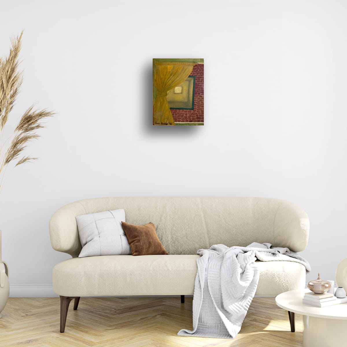 An intimate and atmospheric depiction of a warmly lit interior space, partially obscured by a drawn curtain. The rich golden tones contrast with the textured red brick wall, evoking themes of mystery, privacy, and the beauty of the unseen.