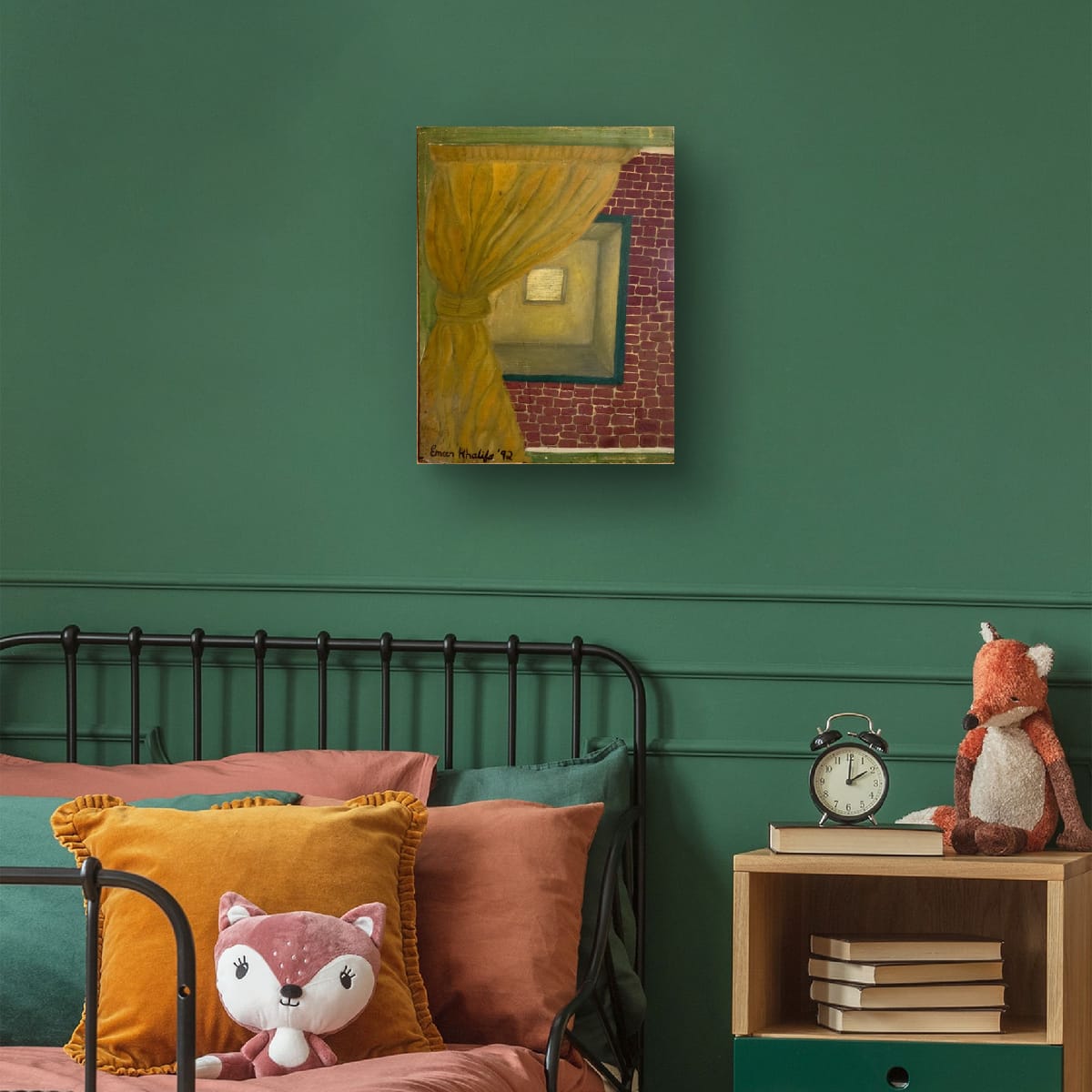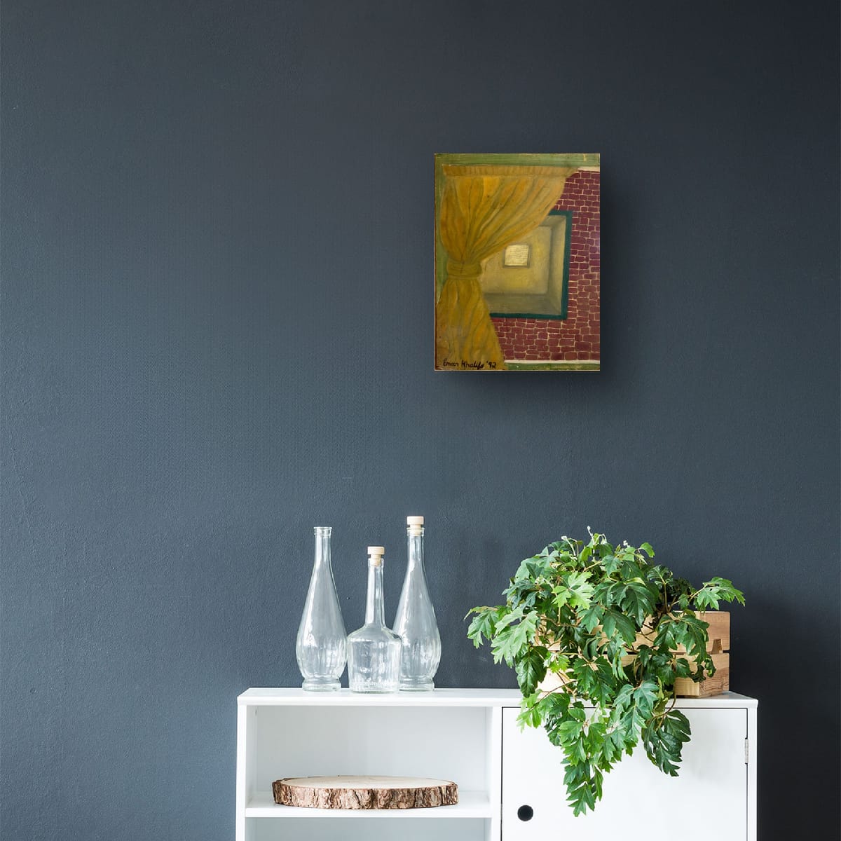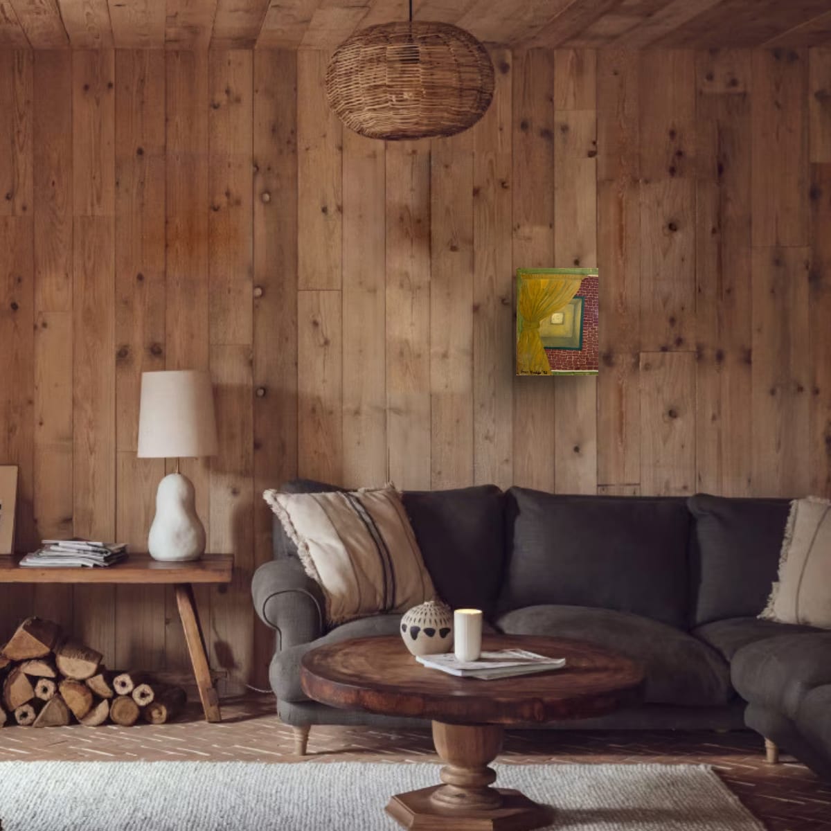 An intimate and atmospheric depiction of a warmly lit interior space, partially obscured by a drawn curtain. The rich golden tones contrast with the textured red brick wall, evoking themes of mystery, privacy, and the beauty of the unseen.