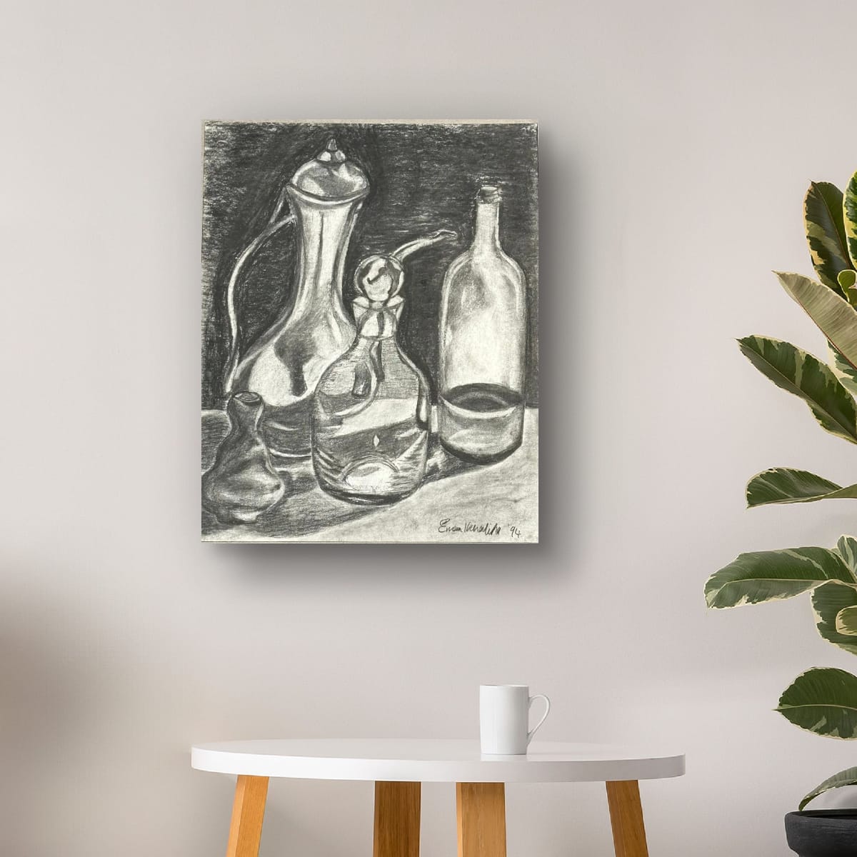 Description: Glass and shadow converse in Silent Reflection. A medley of vessels catch the light in whispered gleams, each curve and contour drawn with restraint and grace. A study of reflection, fragility, and the poise of elegant form.