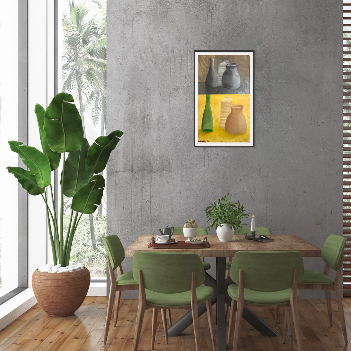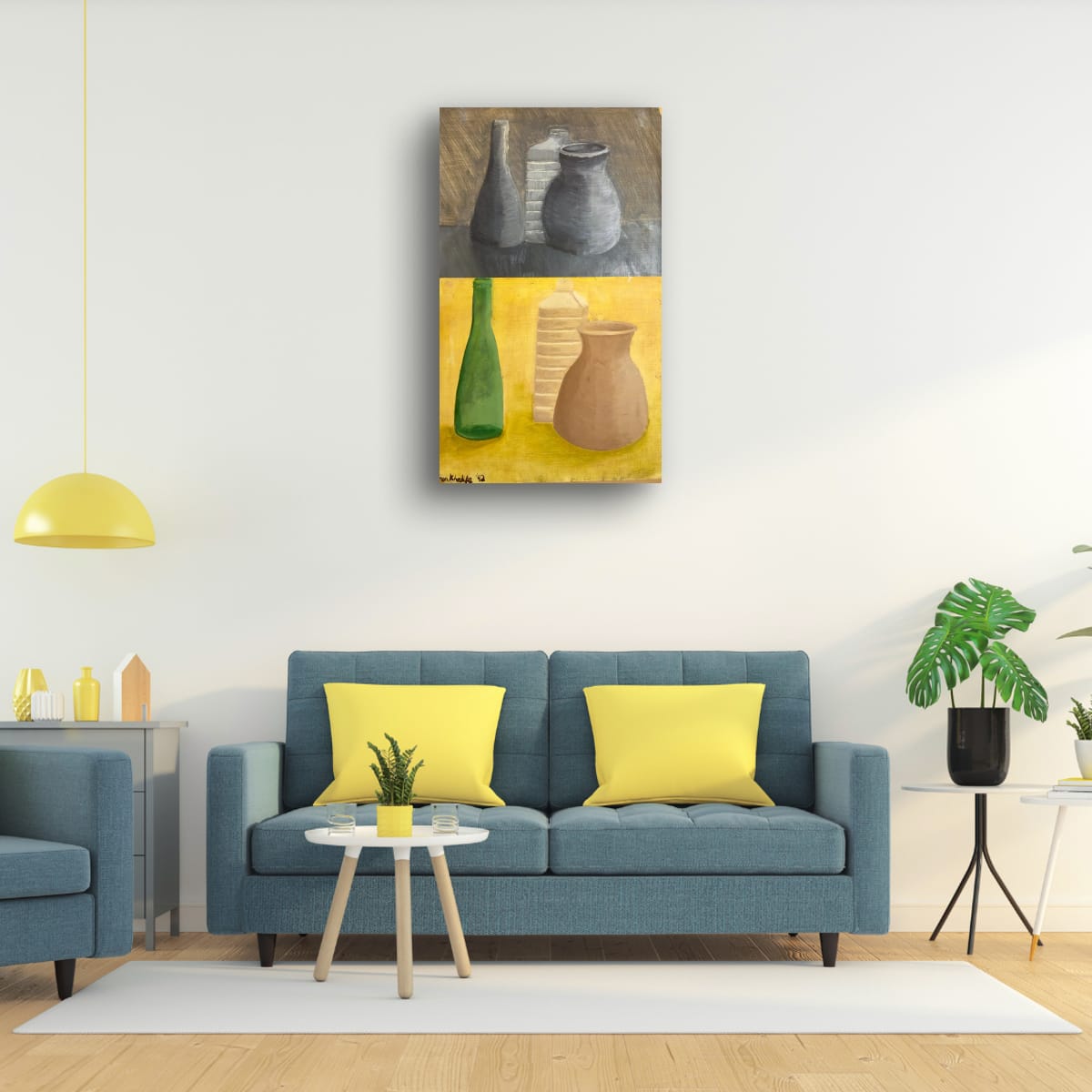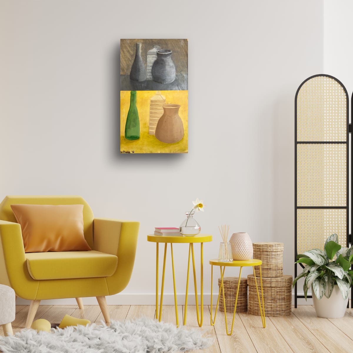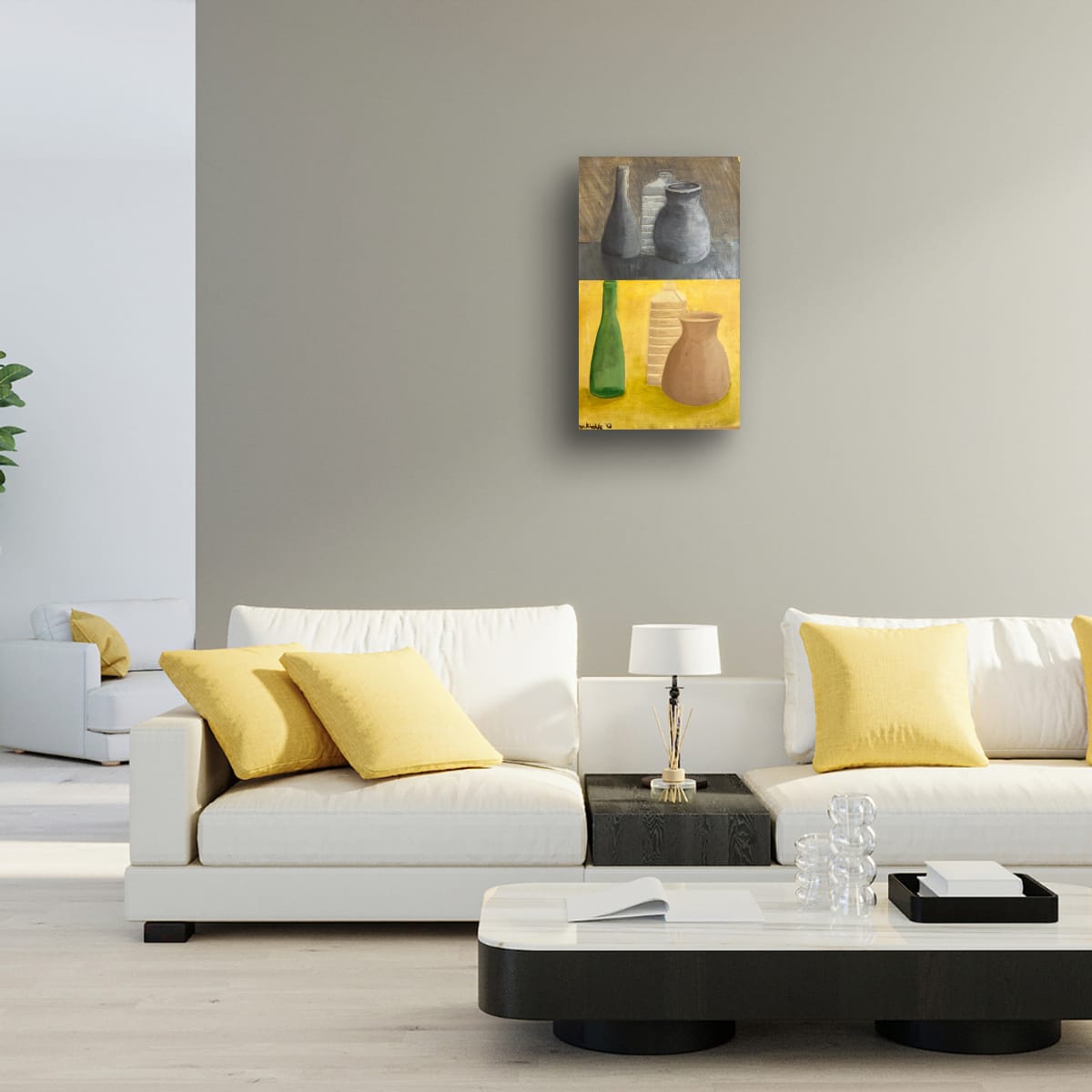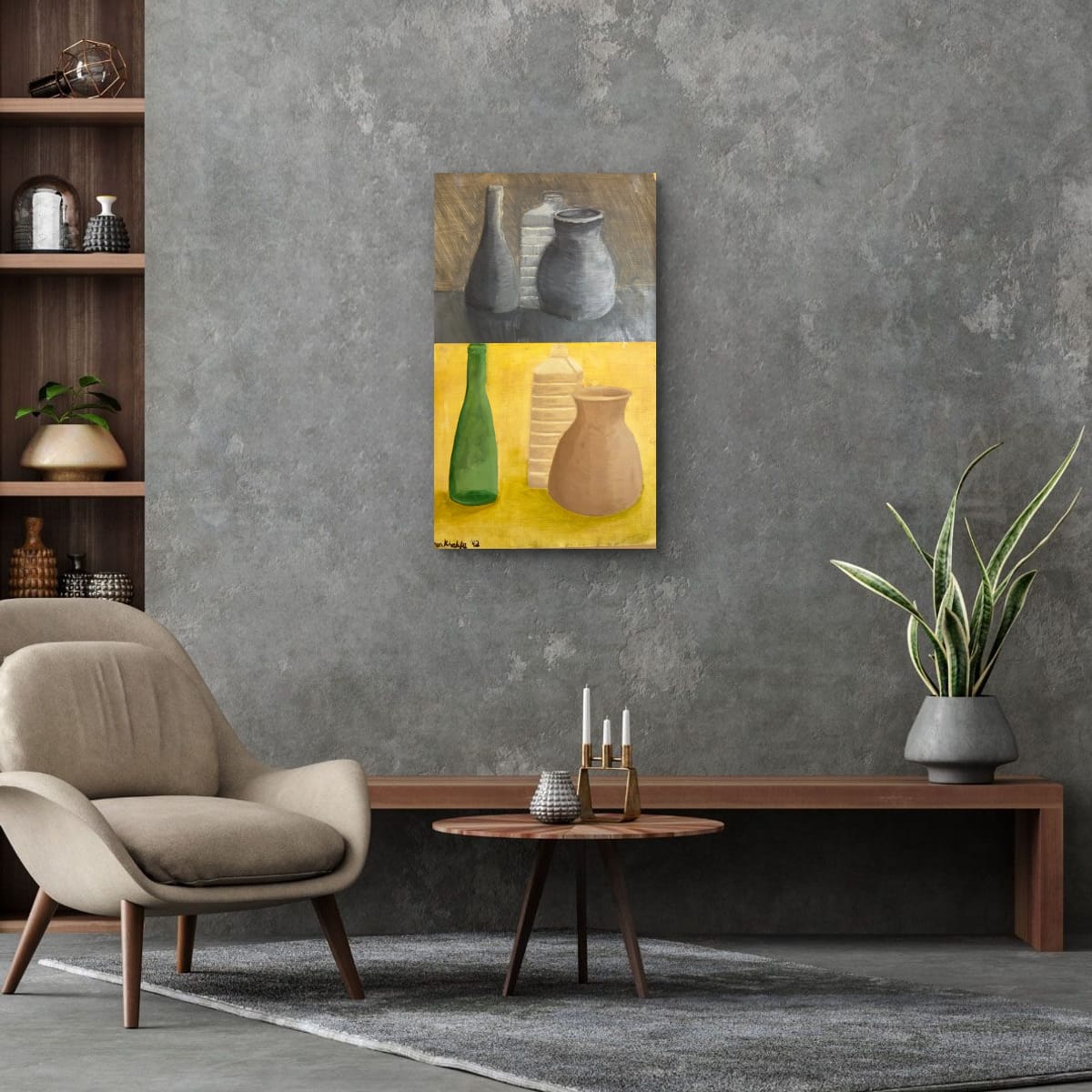 Skins examines how form remains constant while perception shifts. In the upper panel, stripped of color, vessels emerge as pure structure and shadow. Below, the same objects are reimagined through pigment—glass, ceramic, and plastic each asserting their surface identity. The piece reflects on how much of what we see is shaped by what we project: memory, material, expectation. This quiet diptych becomes a meditation on outer layers and internal truths—on what we call real.