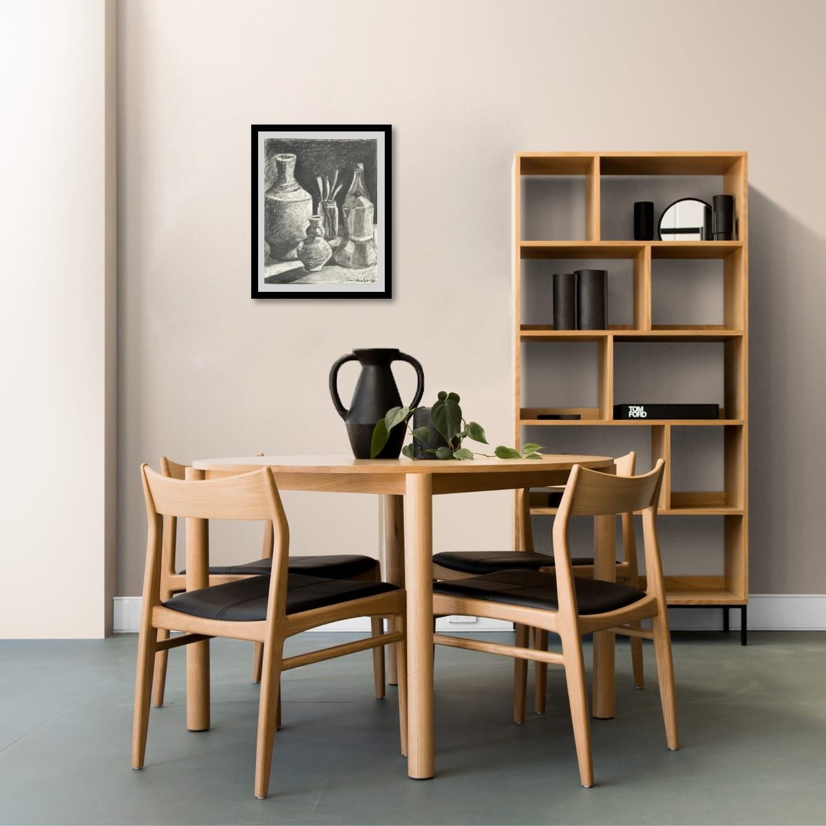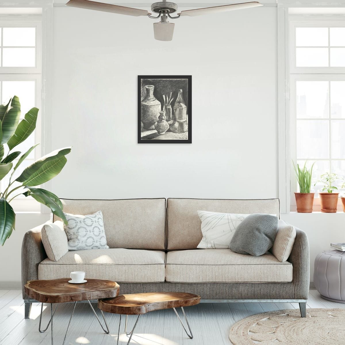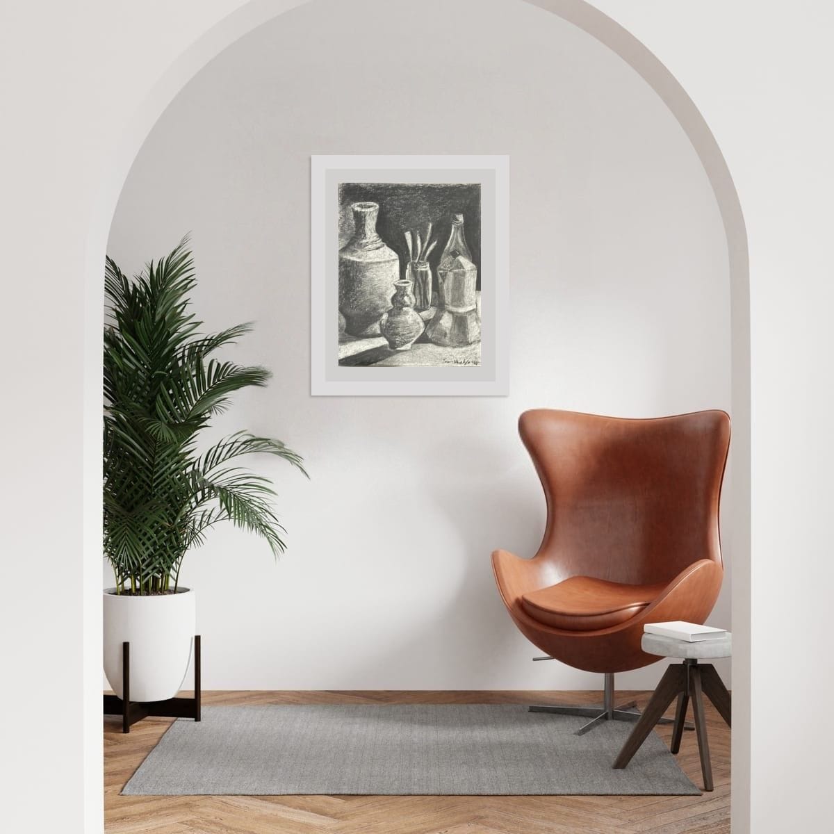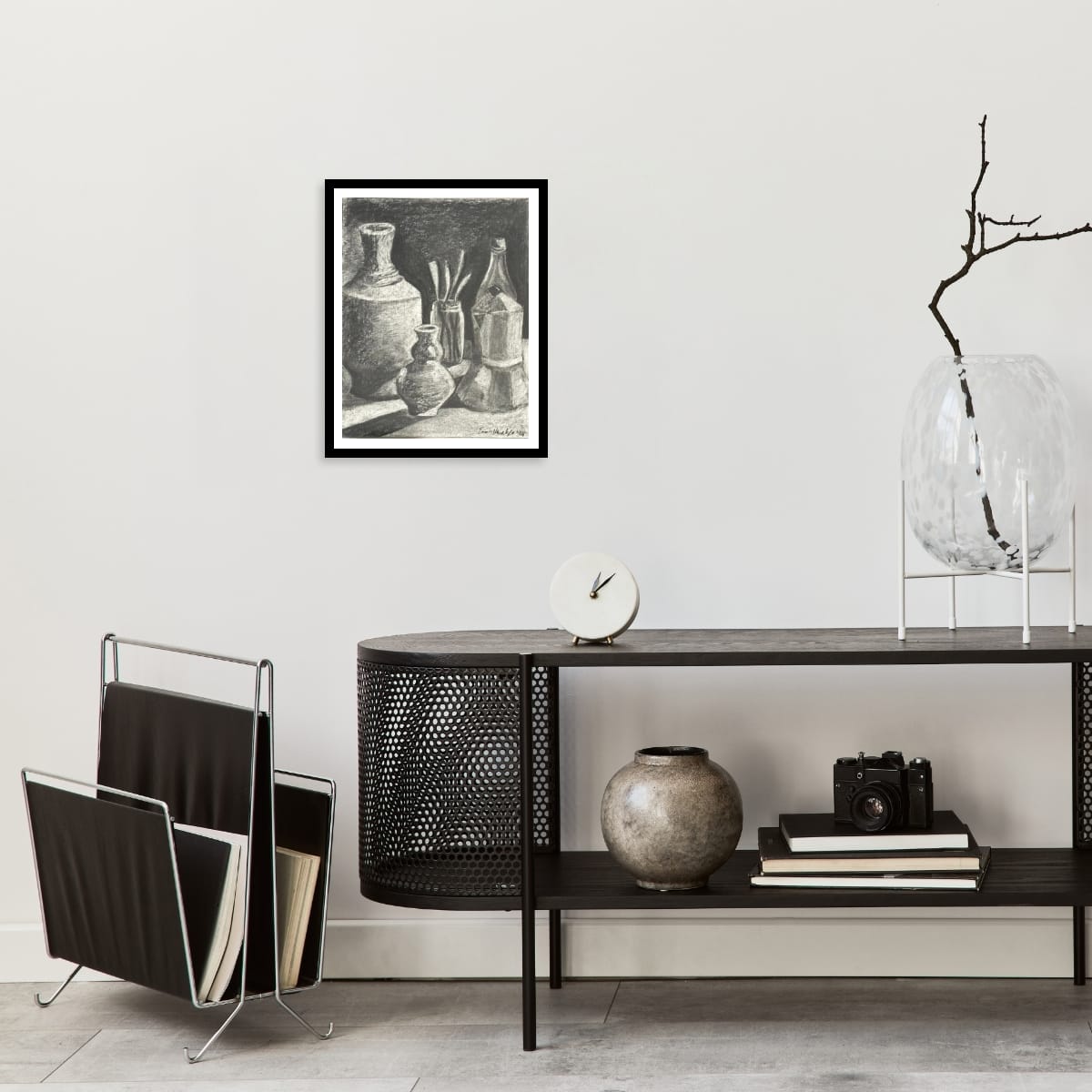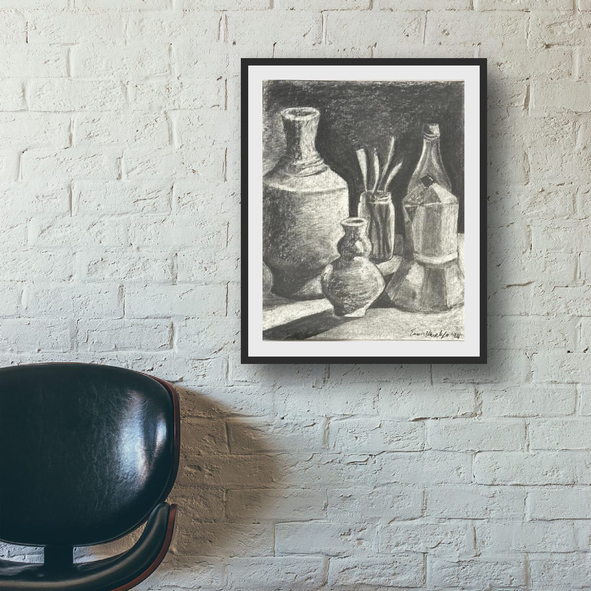 Description: Weight of Silence explores weight and shadow through charcoal’s raw intensity. Vessels and shapes emerge from darkness with quiet clarity. Each form is grounded in silence, giving voice to structure, space, and the timeless elegance of still life.