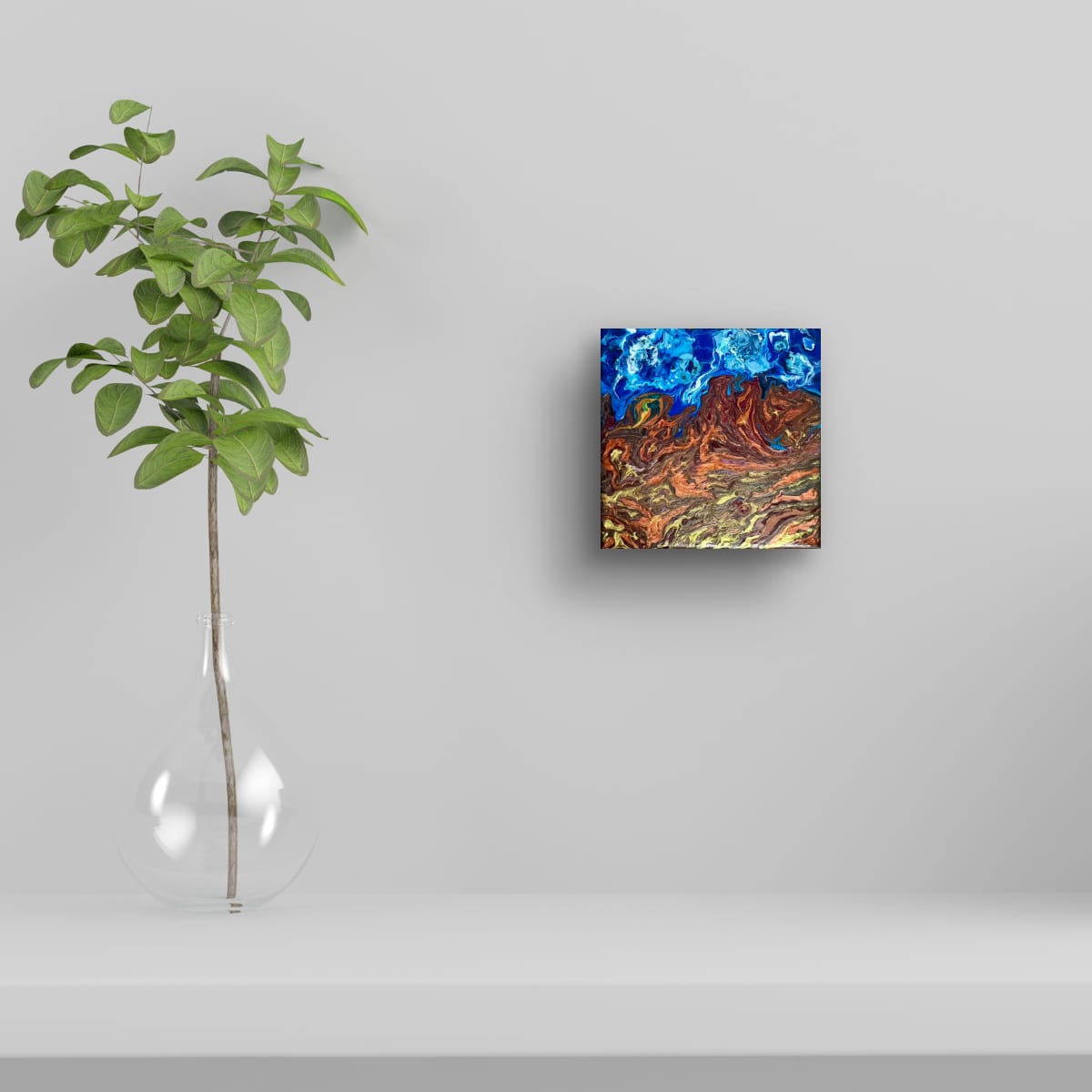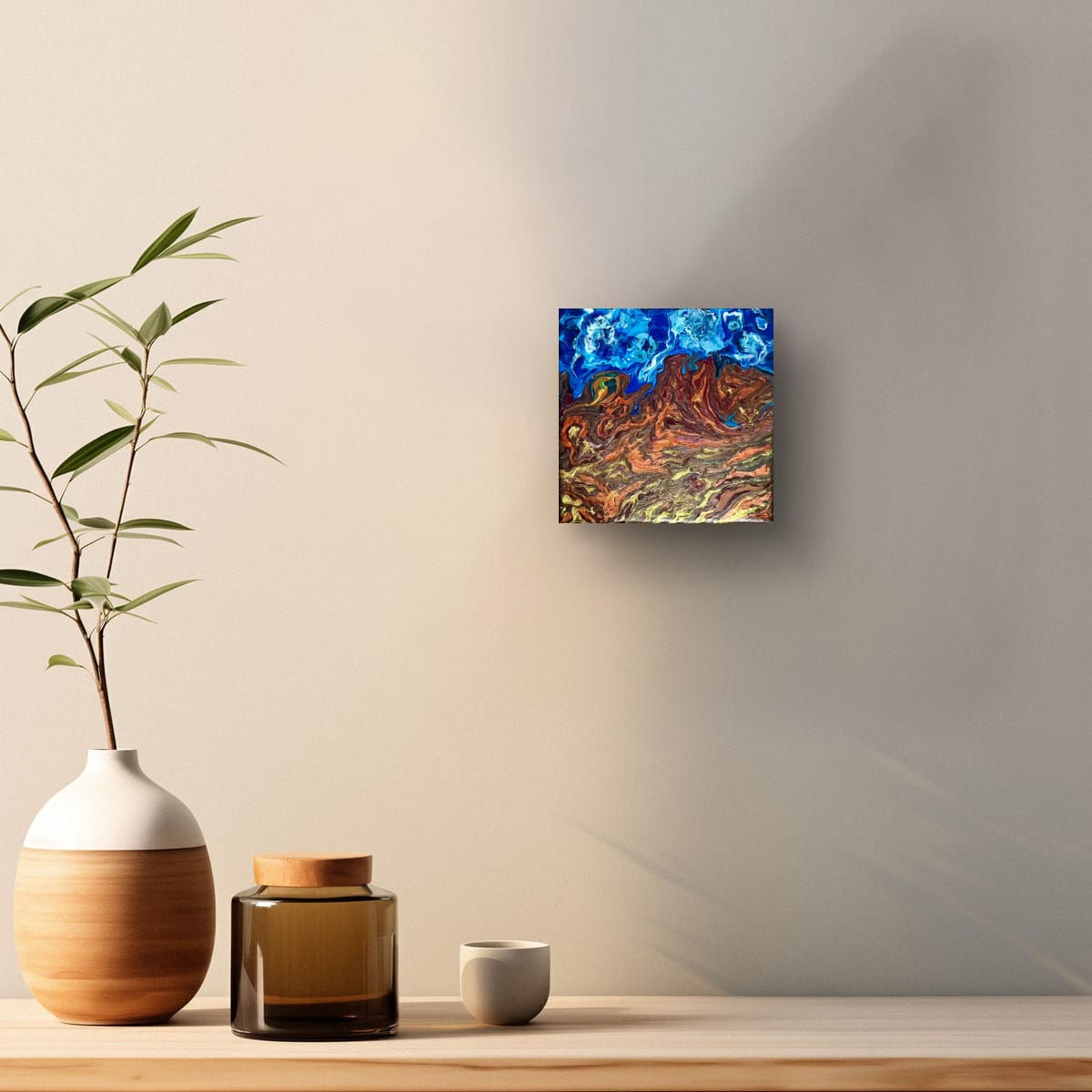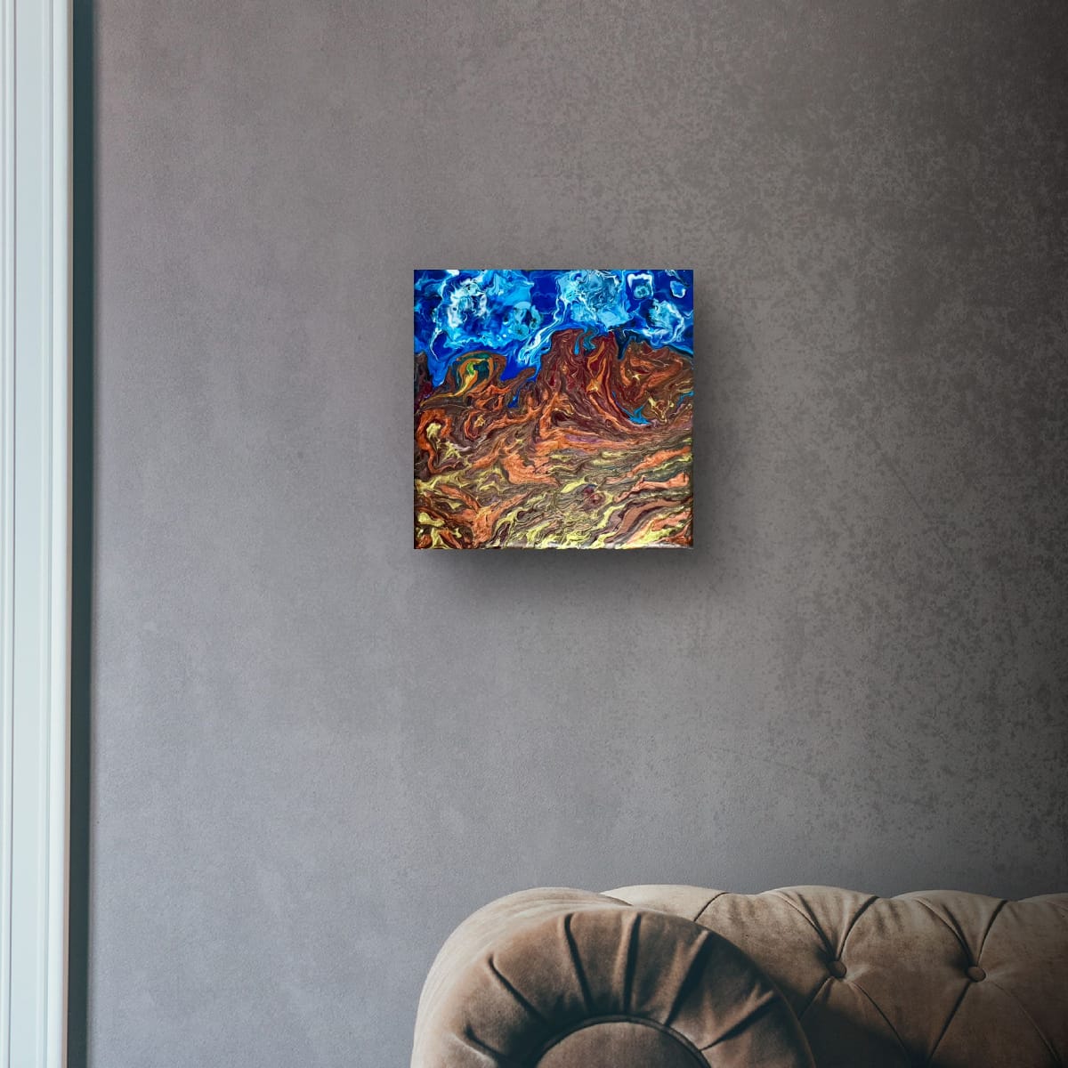 Description: Drawn from the Arabic word “زفير” (Zeffir), meaning “sigh” or “exhalation,” this artwork captures the earth’s elemental release. Rivers of bronze and copper surge upward like cooled magma, while turbulent swirls of blue and white sky unfurl above, echoing the breath that follows eruption. Zeffir is both storm and stillness — a meditation on release after pressure, on transformation born from fire. It speaks to the cycle of renewal, where what erupts in force finds balance again in air and sky.