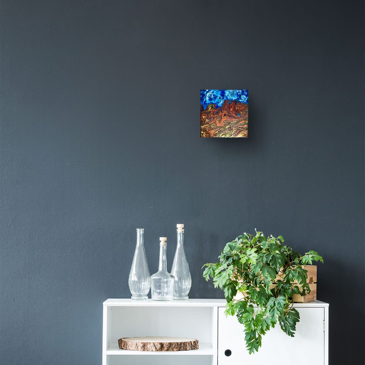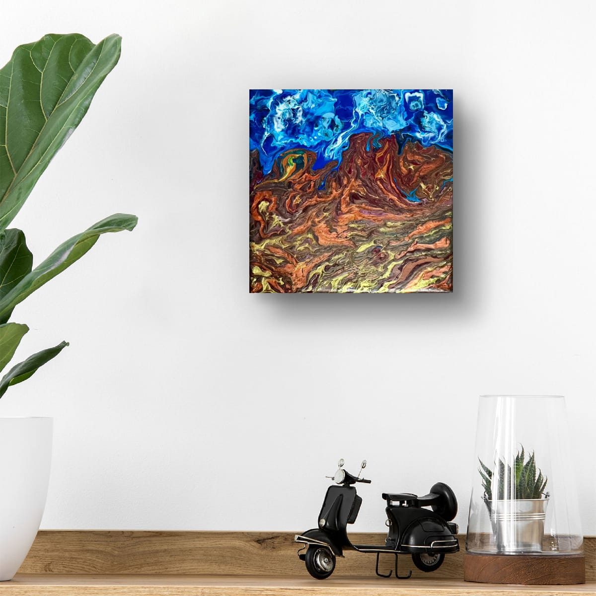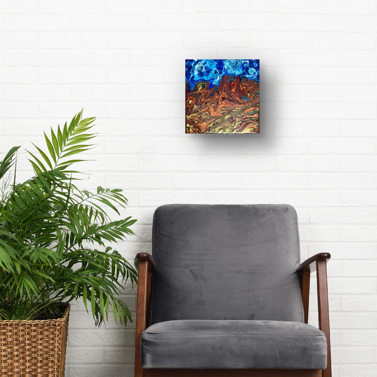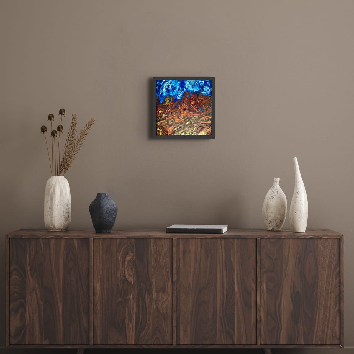 Description: Drawn from the Arabic word “زفير” (Zeffir), meaning “sigh” or “exhalation,” this artwork captures the earth’s elemental release. Rivers of bronze and copper surge upward like cooled magma, while turbulent swirls of blue and white sky unfurl above, echoing the breath that follows eruption. Zeffir is both storm and stillness — a meditation on release after pressure, on transformation born from fire. It speaks to the cycle of renewal, where what erupts in force finds balance again in air and sky.